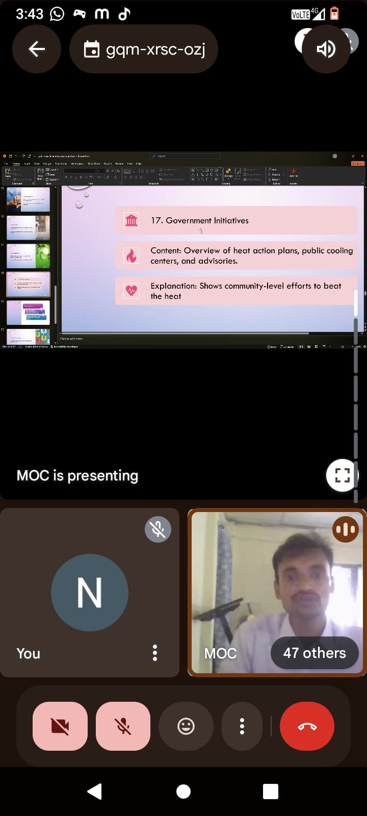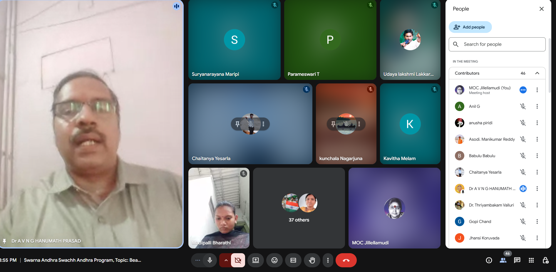“స్వర్ణాంధ్ర – స్వచ్ఛ ఆంధ్ర” కార్యక్రమంలో భాగంగా మాతృశ్రీ ఓరియంటల్ కళాశాల, జిల్లెళ్ళమూడి వారిచే 2025 మే 17న మధ్యాహ్నం 3 గంటలకు గూగుల్ మీట్ ద్వారా Beat the Heat పై అవగాహన కార్యక్రమం నిర్వహించబడింది.