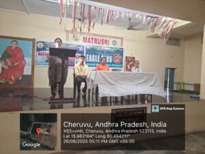 విద్యార్థుల సంక్షేమం, సమాజ పట్ల బాధ్యతను అవగాహన కల్పించేందుకు మాతృశ్రీ ఓరియంటల్ కళాశాల, జిల్లెళ్ళమూడి వారు 26-06-2025 గురువారం EAGLE CLUB మరియు NSS UNIT సంయుక్త ఆధ్వర్యంలో మాదకద్రవ్యాలపై అవగాహన కార్యక్రమాన్ని నిర్వహించారు.ఈ కార్యక్రమానికి ముఖ్య అతిథిగా రేటూరు గ్రామ సచివాలయం మహిళా కానిస్టేబుల్ విజయలక్ష్మి గారు విచ్చేసి మత్తుపదార్థాల వినియోగం వల్ల కలిగే దుష్పరిణామాలు, చట్టపరమైన పరిణామాలు, సమాజంపై ప్రభావం వంటి విషయాలను వివరించారు. ప్రిన్సిపాల్ డా. అన్నదానం హనుమత్ప్రసాద్ గారు అధ్యక్షత వహించి, యువత మత్తుమందులకు దూరంగా ఉండి ఆరోగ్యకరమైన జీవనశైలి పాటించాలన్న సందేశాన్ని ఇచ్చారు. సంస్కృత విభాగాధిపతి Dr. RVNSS వరప్రసాద్ గారు విద్యార్థులను ఉద్దేశించి భారతీయ జ్ఞానపరంపరలోని నైతిక విలువలు, మానసిక స్థైర్యం గురించి ప్రేరణాత్మకంగా ప్రసంగించారు. ఈ కార్యక్రమాన్ని NSS Convener శ్రీ T.జయకృష్ణ గారు నిర్వహించారు. NSS స్వచ్ఛంద సేవలో విద్యార్థులు చురుకుగా పాల్గొని మత్తుపదార్థాలకు దూరంగా ఉండాలని, సమాజంలో ఈ అవగాహనను పెంపొందించాలనే ప్రతిజ్ఞ చేశారు. శాంతిమంత్రం తో కార్యక్రమం ముగిసింది.